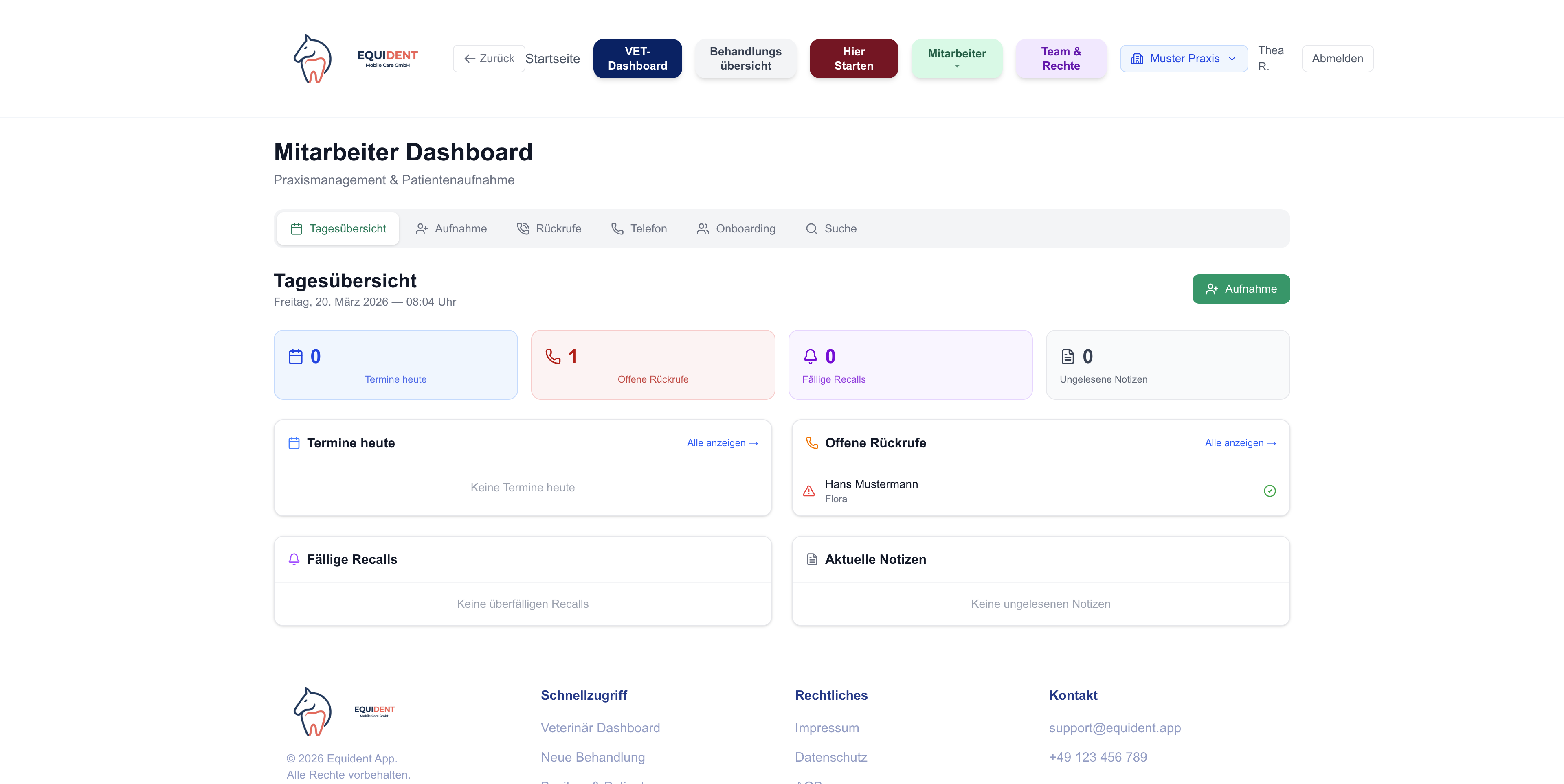 Equident digitalisiert den gesamten Workflow von der Befundaufnahme über das interaktive Dental-Chart bis zur automatischen PDF-Erstellung und Abrechnung. Die App wurde speziell für den Stalleinsatz optimiert — mit Touch-First-Design, offline-fähiger Architektur und einer Oberfläche, die sich intuitiv bedienen lässt. Jede Behandlung wird revisionssicher dokumentiert und als professioneller Bericht direkt an Besitzer versendet.