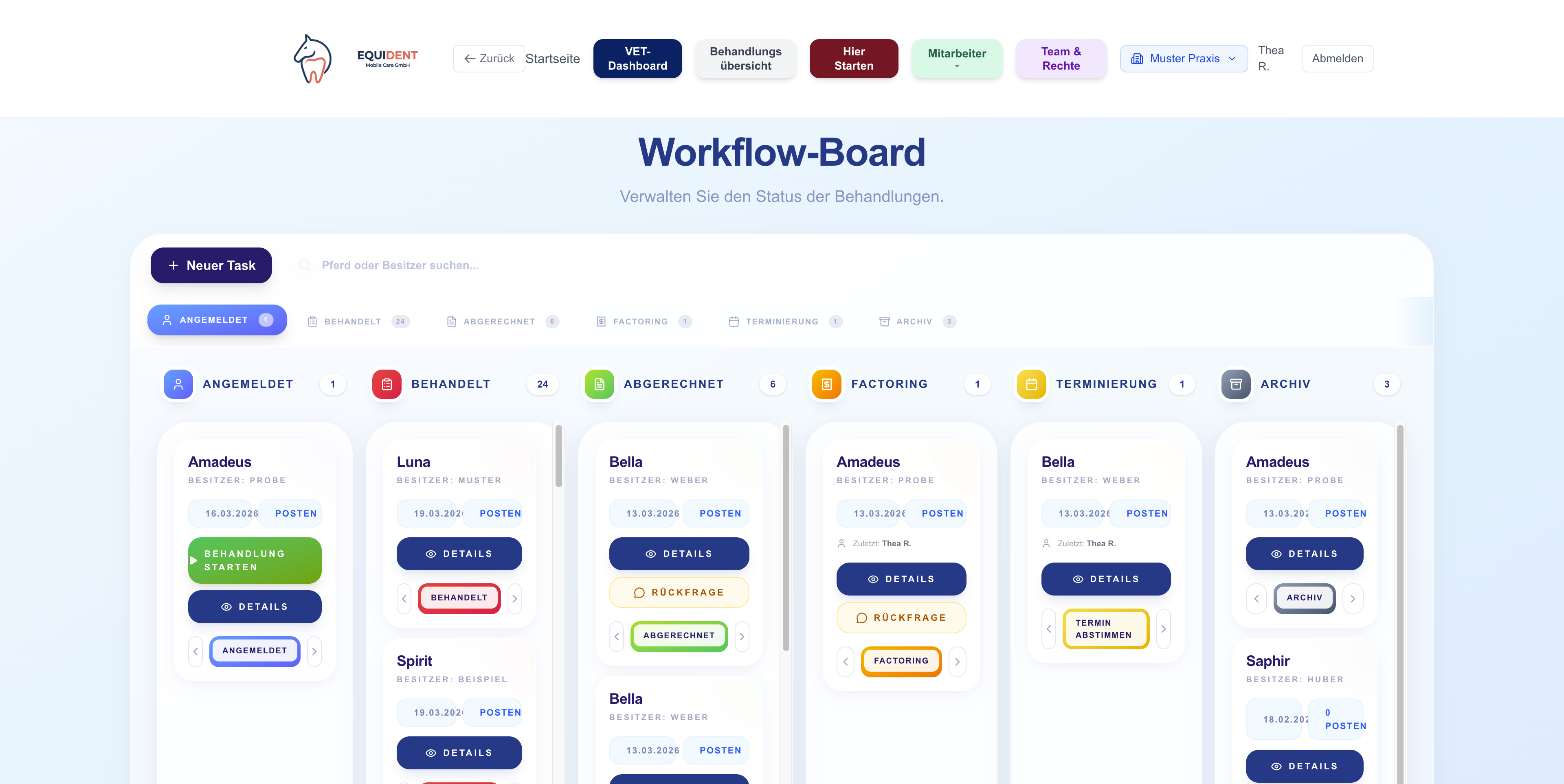 Das Workflow-Board zeigt Ihnen alle aktiven Behandlungen auf einen Blick. Sehen Sie sofort, welche Pferde angemeldet sind, wer gerade behandelt wird und was noch abgerechnet werden muss.