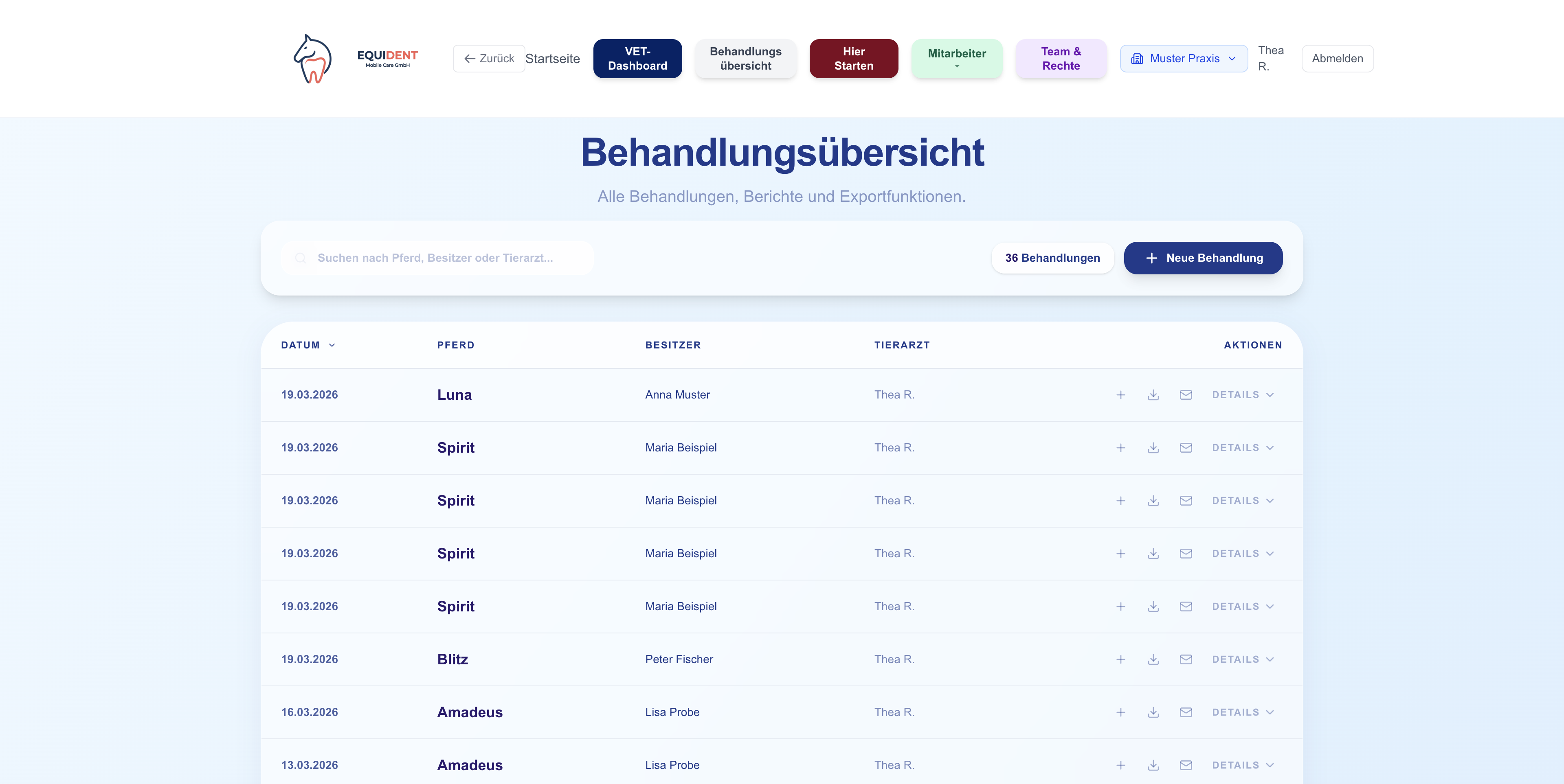 Mit einer intuitiven Benutzeroberfläche und nahtlosen digitalen Workflows vereinfacht Equident die tägliche Arbeit von Pferdezahnärzten grundlegend — von der Befunderfassung bis zur professionellen Dokumentation. Behandlungen werden 60% schneller dokumentiert, die Fehlerquote sinkt signifikant, und Pferdebesitzer erhalten transparente, verständliche Berichte. Die digitale Transformation der equinen Zahnmedizin beginnt hier.